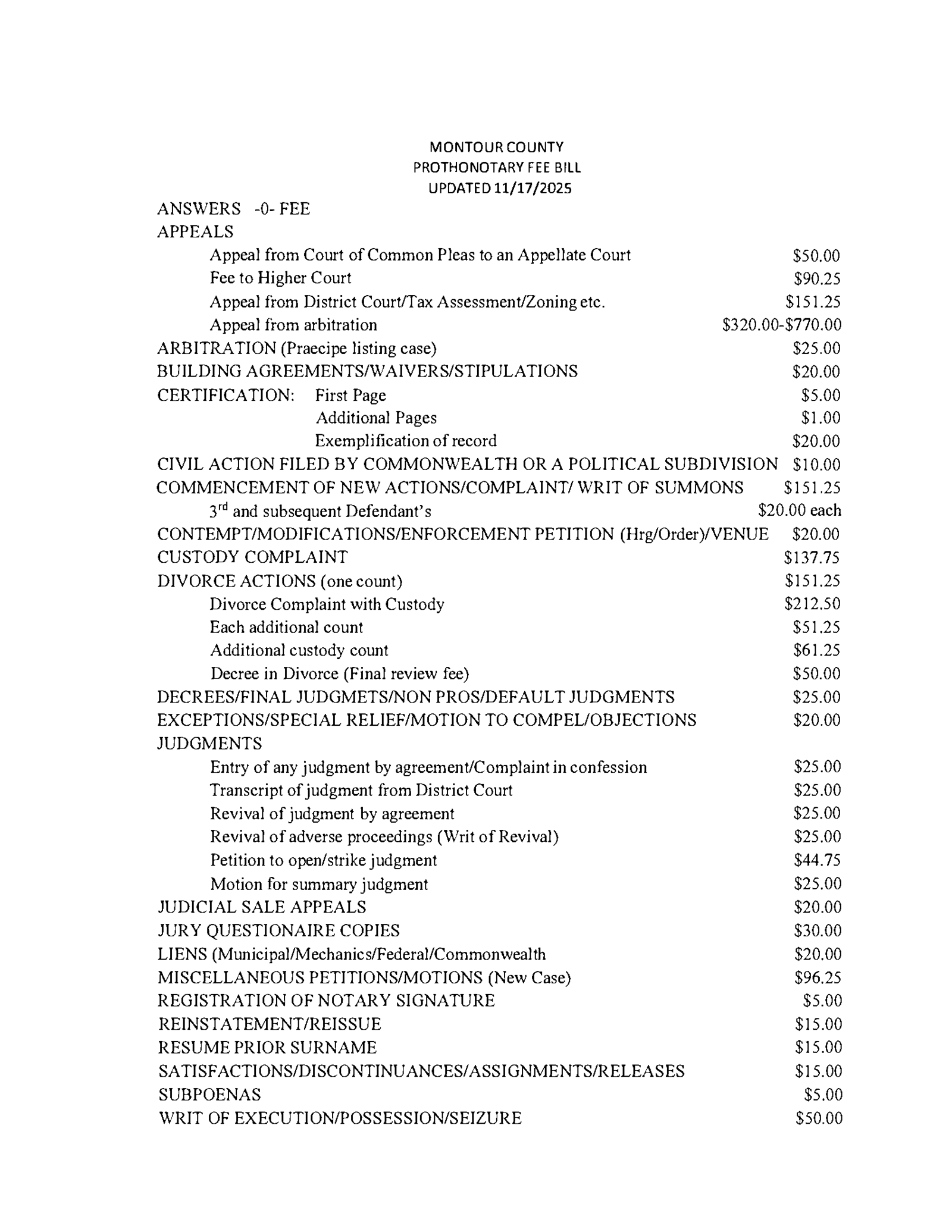 Click here to download the PDF version of the Montour County Prothonotary Fee Bill.